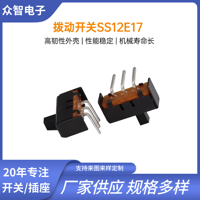 > 直供1P2T立式弯角曲脚滑动开关SS-12E17黑色单排2档3脚拨动开关