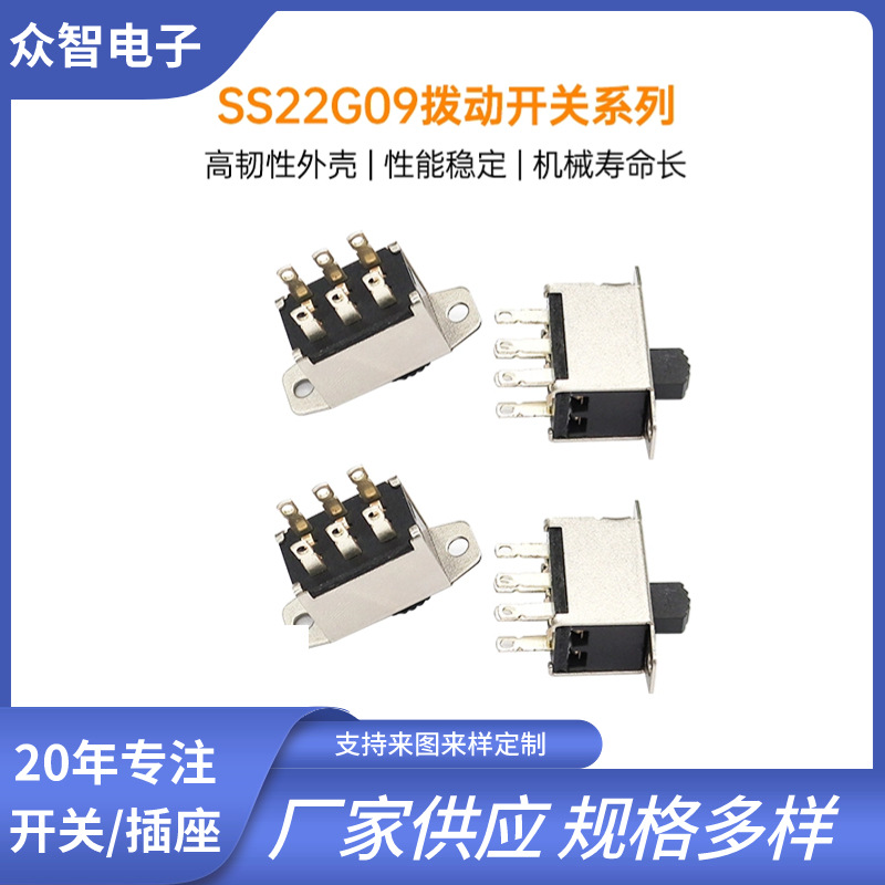 > 厂家供应大电流SS-22G09双刀双掷10A2档6脚立式双排滑动开关 2P2T