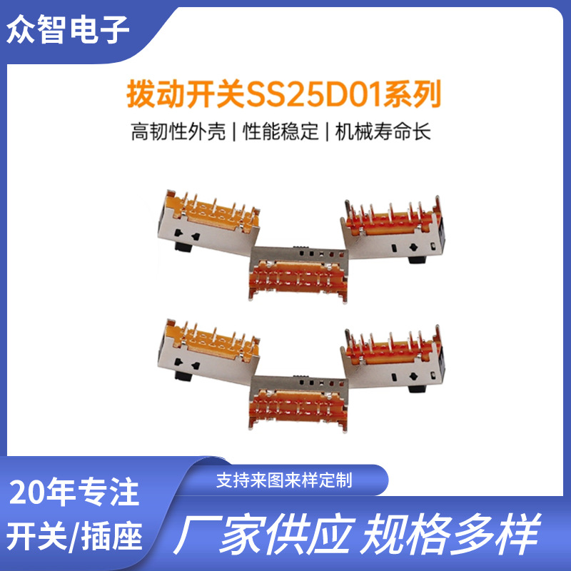 > SS-25D01双排五档12脚立式有插拨动开关 2P5T耐高温灯饰开关